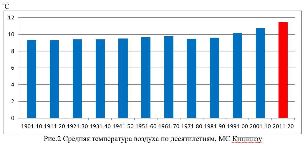 Следует отметить, что в Молдове так же, как и в глобальном климате, период с 2011 по 2020 год стал самым теплым десятилетием за всю историю наблюдений (рис.2).